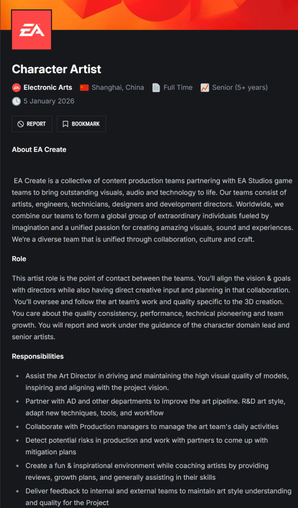 As seen above, EA is hiring for 3D character artists. This job role is very prevalent in the gaming industry. But it is very difficult to get into. As such, it is becoming increasingly more sought after.