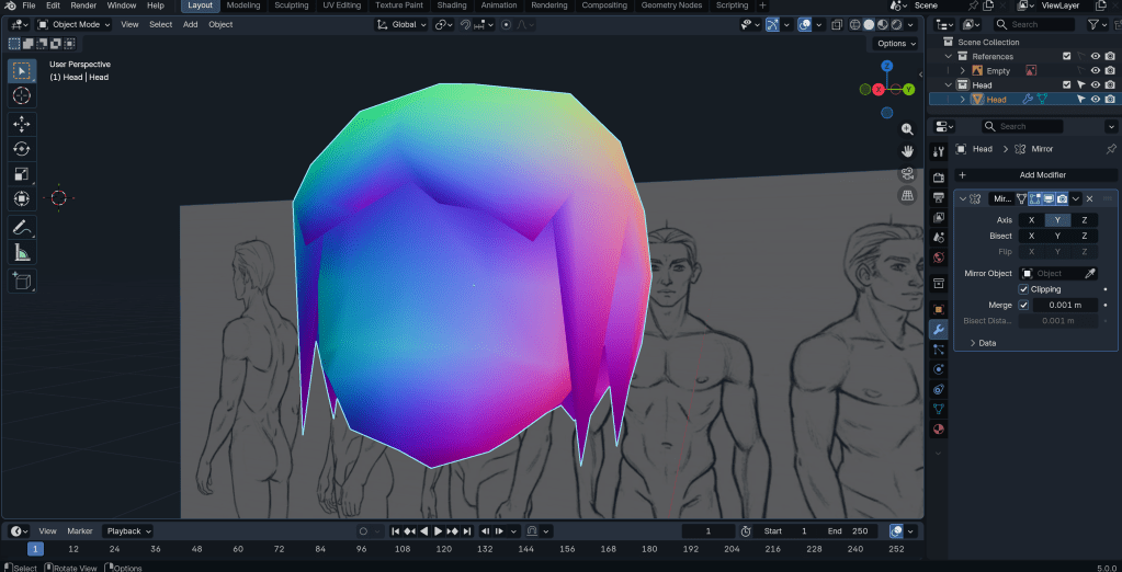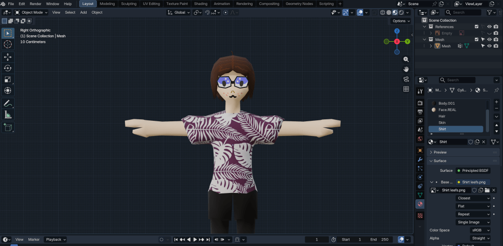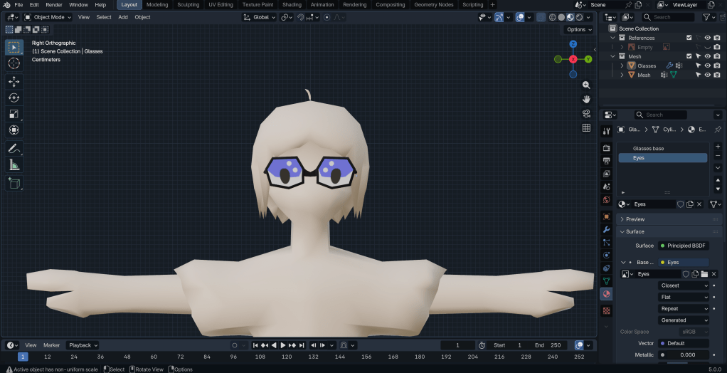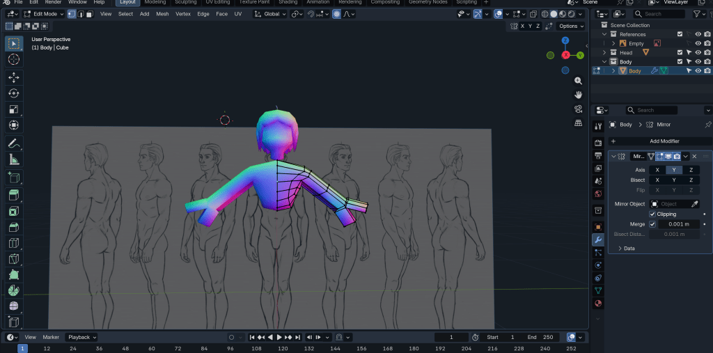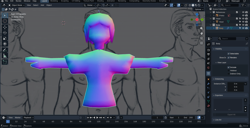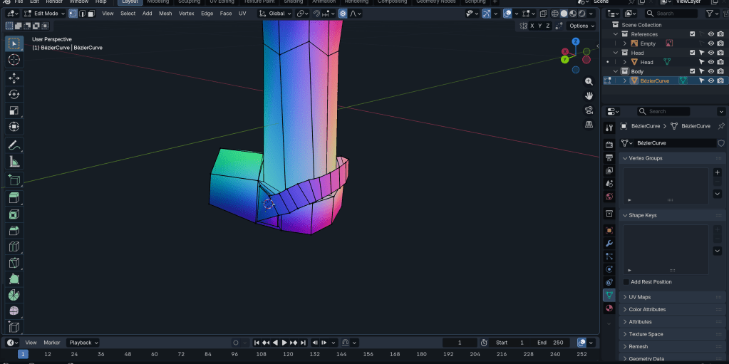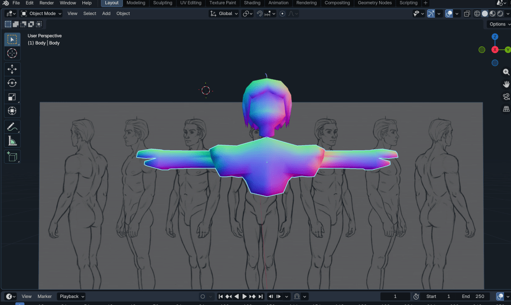 After merging the neck to the body, the base mesh is more or less done. Next, I want to try texturing.